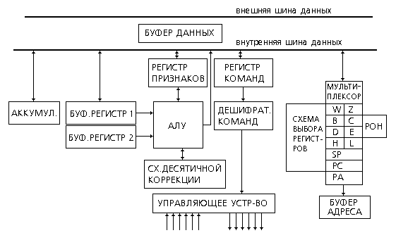 Управляющая память содержит микропрограммы всех 78-ми команд для данного МП. АЛУ дополняется схемой десятичной коррекции для действий над двоично-