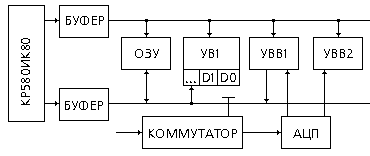 Эта система предназначена для последовательного опроса 8-ми аналоговых датчиков и передачи информации в ОЗУ. Опрос датчиков преобразования аналоговой информации в цифровую, запись информации в ОЗУ производится под управлением МП.
