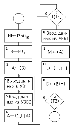 например будем считать, что первая занятая ячейка ОЗУ имеет номер 1350 в шестнадцатиричной системе. В нее будет помещен результат опроса 1-го датчика с номером 000. Через аккумулятор и шину данных номер датчика подается на устройство вывода 1 (УВ1). УВ1 подает номер датчика на коммутатор. Коммутатор опрашивает нужный датчик и передает аналоговый сигнал на АЦП. АЦП преобразует аналог. сигнал в цифровой и передает цифровой сигнал на УВВ1. Если в первом такте импульсной последовательности Ф1 МП передает номер датчика, то во втором такте он ожидает прихода сигнала окончания преобразования от АЦП. Сигнал окончания равный 1 передается через УВВ2, через шину данных в аккумулятор. Наличие сигнала окончания аккумулятор проверяет операцией циклического сдвига вправо. Если сигнал окончания пришел, то при сдвиге вправо 1 из младшего разряда аккумулятора передается в триггер сдвига ТС, триггер сдвига опрокидывается в состояние 1 и данные из устройства ввода 1 по шине данных передаются в аккумулятор, а из него в ячейку ОЗУ. Содержимое пары регистров HL и регистра В увеличивается. на 1, при этом формируется номер следующего датчика и номер ячейки, куда должен быть помещен следующий результат.