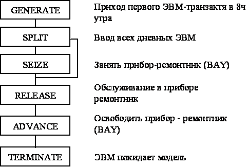Рассмотрим сегмент планового осмотра ЭВМ. (Рис.1.). Транзакты, подлежащие плановому осмотру, являются пользователями обслуживающего прибора (ремонтник), которым не разрешен его захват. Эти ЭВМ-транзакты проходят через первый сегмент модели каждый день с 8 ч утра.ЭВМ-транзакт входит в этот сегмент. После этого транзакт поступает в блок SPLIT, порождая необходимое число транзактов, представляющих собой ЭВМ, запланированные на этот день для осмотра.Эти ЭВМ-транзакты проходят затем через последовательность блоков SEIZE-ADVANCE-RELEASE и покидают модель. .