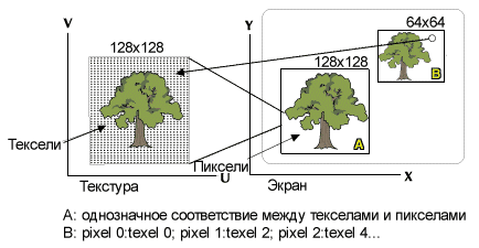 Сэмплинг (point-sampling) – простейший метод текстурирования, в котором для отображения одной точки используется всего один тексел (рисунок ниже). Этому методу присущ серьезный артефакт: когда наблюдатель приближается вплотную к текстурированной поверхности, происходит пикселизация. Для избежания этого артефакта используют другие методы текстурирования, основанные на фильтрации текстур.