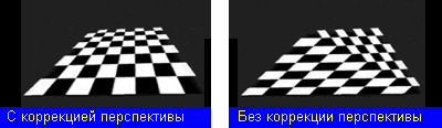 Когда полигоны текстурируются, необходимо учитывать перспективу. Для того, чтобы текстурированные объекты выглядели правильно, необходима перспективная коррекция. Она гарантирует, что текстура правильно наложится на разные части объекта. Перспективная коррекция – ресурсоемкая процедура (одна операция деления на каждый пиксел), поэтому 3D-ускорители должны реализовывать ее аппаратно. Но разные ускорители достигают разного качества перспективной коррекции.