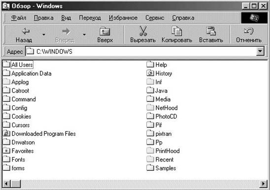 Кнопки НАЗАД, ВПЕРЕД и ВВЕРХ позволяют перемещаться по папкам и файлам. Кнопка ВЫРЕЗАТЬ позволяет поместить в буфер обмена папку или файл с последующим удалением, кнопка КОПИРОВАТЬ позволяет скопировать в буфер обмена папку или файл, кнопка ВСТАВИТЬ позволяет вставить из буфера обмена папку или файл. Кнопка ОТМЕНИТЬ позволяет отменить последнее выполненное действие. Кнопка Удалить – удаляет выбранный объект (файл или папку). Кнопка СВОЙСТВА выводит окно свойств объекта с указанием его типа, размера, расположения и пр. Кнопка ВИД позволяет изменить вид представления информации на рабочем поле (в виде списка, таблицы или значков).
