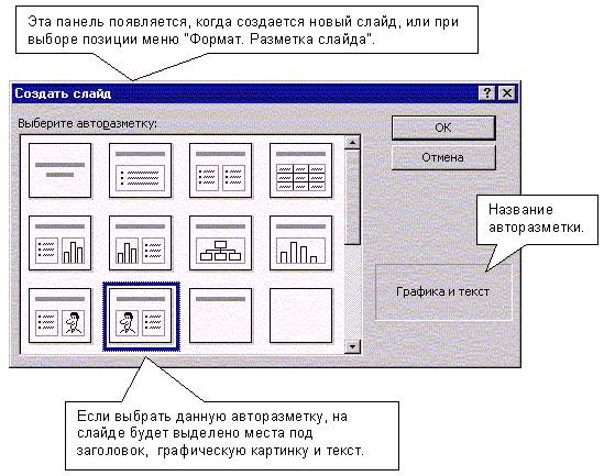 Для создания слайда используется команда Вставка, Новый слайд. При этом откроется окно, позволяющее выбрать авторазметку для создаваемого слайда.
