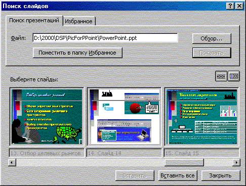 Также можно скопировать слайд из другой презентации (другого файла). Для копирования слайдов из другой презентации в PowerPoint есть специальная панель (главное меню Вставка, Слайды из файлов).