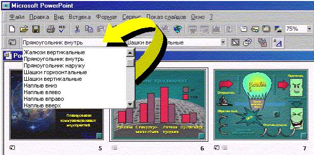 Назначение эффекта перехода в режиме сортировщика осуществляется путем выбора нужного эффекта в окне «Эффекты при смене слайда», либо через главное меню Показ слайдов, Смена слайда.