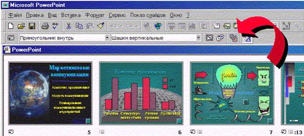 В режиме сортировщика слайдов можно эффективно обрабатывать группы слайдов. Процедуры обработки нескольких слайдов сводятся к выделению группы рядом стоящих слайдов и применению к ней требуемых действий.