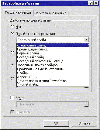 5. Для каждого элемента списка создать ссылку на соответствующую произвольную демонстрацию (Показ слайдов, Настройка действия);