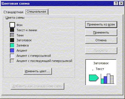 Ниже приведено описание восьми полей, цвет которых формирует цветовую схему и определяет цветовое оформление элементов слайда: