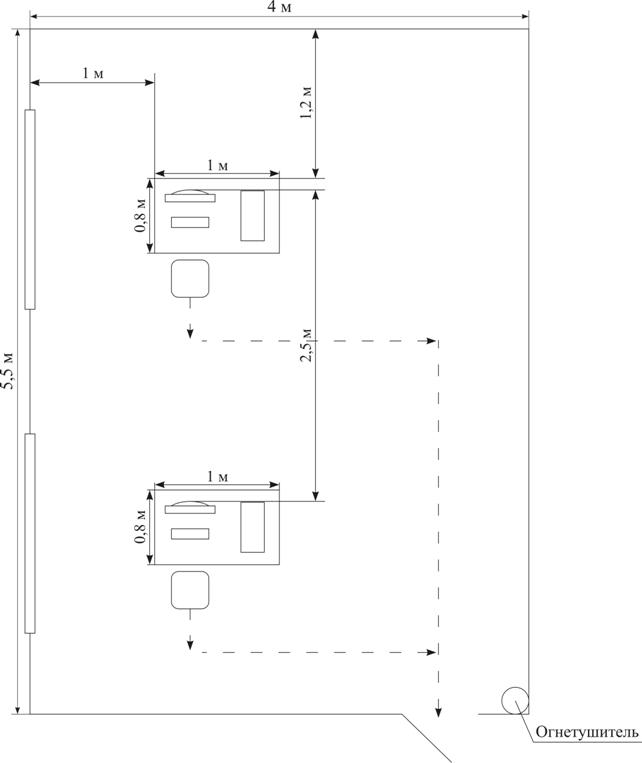 Каждое рабочее место в должно соответствовать требованиям ГОСТ 12.2.032-78. Рабочие места следует располагать относительно световых проемов так, чтобы естественный свет падал со стороны, преимущественно слева, при этом должны быть выдержаны следующие расстояния: от стен со световыми проемами до рабочего места – не менее 1 м, между боковыми поверхностями видеотерминалов – не менее 1,2 м, между тыльной поверхностью одного видеотерминала и экраном – не менее 2,5 м. План размещения рабочих мест представлен на рис. 3.3.