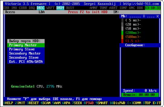 Для выбора винчестера, с которым будет работать программа, необходимо нажать на клавиатуре клавишу P. После этого появится окно выбора порта, на котором работает винчестер.