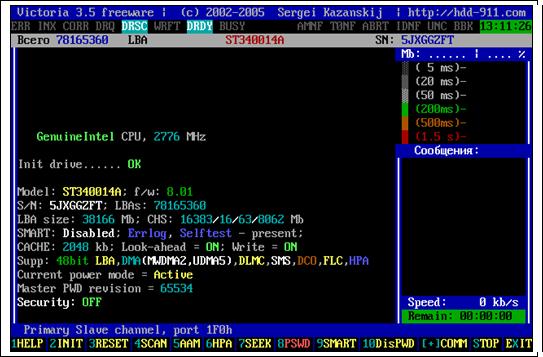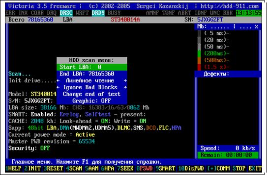 Программа также позволяет скрывать bad-блоки на диске (remap). Этот параметр настраивается в четвертом сверху пункте меню. Поддерживаются следующие режимы: Ignore Bad Blocks (режим скрытия дефектов отключен), BB = RESTORE DATA(подходит в большинстве случаев), BB = Advanced REMAP, BB = Fujitsu Remap и BB = Erase 256 sect. Следует учесть, что эта возможность работает только при трех типах проверки: Линейное чтение, Случайное чтение и BUTTERFLY-чтение.