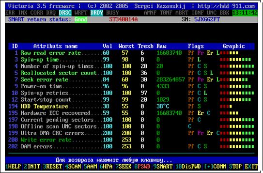 Названия наиболее важных атрибутов выделены зеленым цветом. А атрибут, показывающий температуру винчестера, выделен желтым цветом.