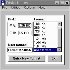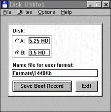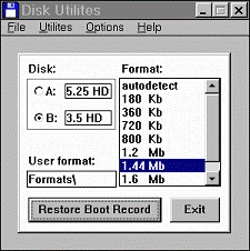 Требуется задать имя диска (A: или B:), тип формата (180 Kb, 360 Kb, 720 Kb, 800 Kb, 1.2 Mb, 1.44 Mb, 1.6 Mb). Также формат можно задать как “auto detect” (автоматическое определение типа формата) или “user format”. При “user format” надо задать имя файла, содержащего загрузочную запись (512 байт). Поэтому нет ограничения на количество форматов, и стандартно поддерживаются только семь - самых основных. Пользователь может сам создать загрузочную запись, содержащую требующийся ему формат, с помощью утилиты “Save User Boot Record”, описание которой вы найдете чуть дальше.