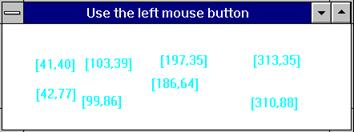 Нижеследующее приложение откликается на щелчки левой кнопки мыши, выводя в рабочей зоне окна координаты указателя мыши в голубом цвете.