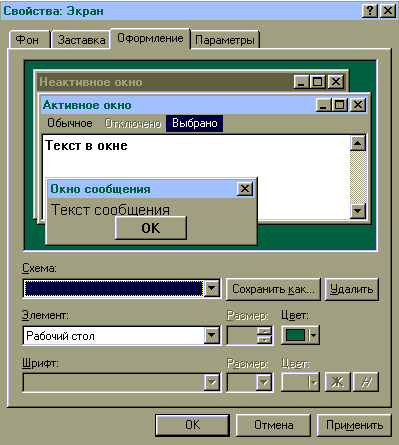 В раскрывающимся списке с названием Схема (Sheme) можно увидеть поставляющийся вместе с WINDOWS схемы оформления элементов пользовательского интерфейса. При выборе того или иного названия из списка схем WINDOWS будет показывать соответствующее оформление в окне предварительного просмотра. Для выбора устраивающей схемы достаточно выделить ее название и щелкнуть по кнопке ОК.
