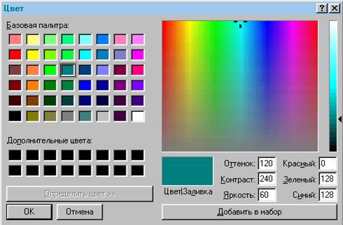 — подобрав нужный цвет, можно добавить его в цветовую палитру дополнительных цветов щелчком по кнопке Добавить в набор (Add To Custom Colors). WINDOWS добавит выбранный цвет в первую ячейку таблицы Дополнительные цвета (при желании замены одного из имеющихся в конкретной ячейки цвета на новый, нужно перед тем как щелкнуть по кнопке Добавить в набор, отметить эту ячейку).