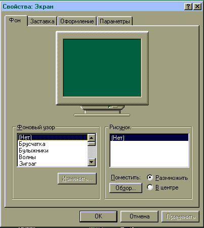 Замечание: При щелчке по кнопке Обзор в окне Фон, WINDOWS покажет имена файлов, имеющие расширение ВМР или DIB. Можно использовать файлы этих типов. А также файлы с расширением RLE.