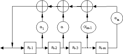 Генератор М-последовательности с сумматорами по модулю два, стоящими в цепи обратной связи: аi,ai-1,ai-2,…ai-m – символы последовательности; ai – коэффициенты, определяющие вид обратной связи.