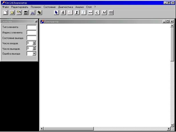 Программа написана под операционную систему Windows 95. Так как сама операционная система Windows 95 является графической, то интерфейсы программ написанных под эту систему похожи друг на друга. Вследствие этого обучение работе с данной программой облегчается. Графический интерфейс построен таким образом, чтобы пользователю было, как можно удобнее и понятней работать с программой. Все необходимые команды доступны через главное меню. Главное меню — это специальная панель инструментов, расположенная в верхней части экрана, которая содержит такие меню, как: Файл, Редактировать, Полином, Состояние, Диагностика, Анализ, Стоп. Через эти меню становятся доступны основные функции программы. На главной форме расположены кнопки логических элементов, генераторов, индикаторов.