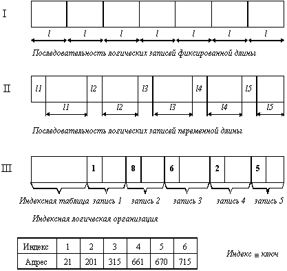 Записи могут быть расположены в файле последовательно (последовательная организация) или в более сложном порядке, с использованием так называемых индексных таблиц, позволяющих обеспечить быстрый доступ к отдельной логической записи (индексно-последовательная