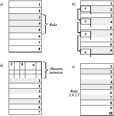 Рис. 1.4. Физическая организация файла а - непрерывное размещение; б - связанный список блоков; в - связанный список индексов; г - перечень номеров блоков