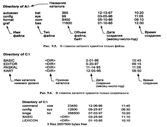 Рассмотрим возможные варианты содержимого каталога. 1-й вариант. В каталоге хранятся только записи о файлах (рис. 9.5). Перед записями о файлах выводится сообщение о названии каталога. В данном случае — это главный каталог гибкого диска А. В конце содержимого каталога выводится сообщение о количестве файлов, хранящихся на диске, и о свободном пространстве диска в байтах. Например, в приводимом выше каталоге выводится сообщение: