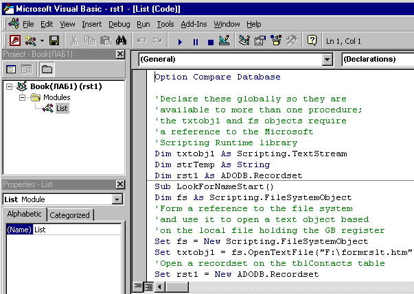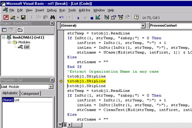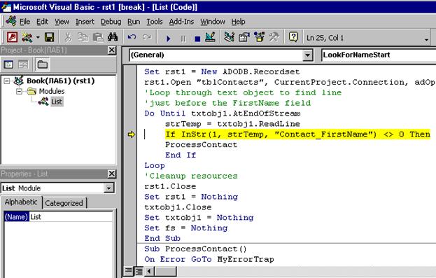 Set fs = New Scripting.FileSystemObject Set txtobj1 = fs.OpenTextFile (“ F:\formrslt.htm", ForReading) ' Откройте recordset на tblContacts таблице Set rst1 = New ADODB.Recordset rst1.Open "tblContacts", CurrentProject.Connection, adOpenKeyset,_ adLockOptimistic ' Пройти цикл через текстовый объект для нахождения линии как раз ‘перед ‘FirstName полем Do Until txtobj1.AtEndOfStream strTemp = txtobj1.ReadLine If InStr(1, strTemp, "X_FirstName") <> 0 Then ProcessContact End If Loop