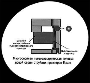 Для реализации пьезоэлектрического метода в каждое сопло установлен плоский пьезокристалл, связанный с диафрагмой. Под воздействием электрического тока происходит деформация пьезоэлемента. При печати, находящийся в трубке пьезоэлемент, сжимая и разжимая трубку, наполняет капиллярную систему чернилами. Чернила, которые отжимаются назад, перетекают обратно в резервуар, а чернила, которые выдавились наружу,