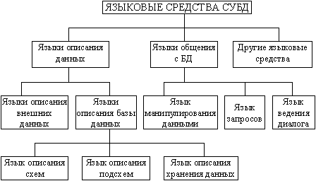 Языковые средства СУБД, необходимые для описания данных, организации общения и выполнения процедур поиска и различных преобразований данных. Классификация языковых средств БнД, показанная на рис. 2.2, разработана американским комитетом CODASYL по проектированию и созданию БД.