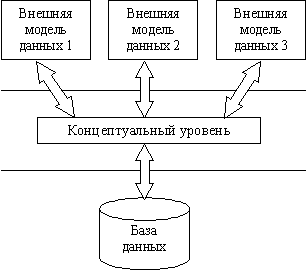 1. Уровень внешних моделей — самый верхний уровень, где каждая модель имеет свое «видение» данных. Этот уровень определяет точку зрения на БД отдельных приложений. Каждое приложение видит и обрабатывает только те данные, которые необходимы именно этому приложению. Например, система распределения работ использует сведения о квалификации сотрудника, но ее не интересуют сведения об окладе, домашнем адресе и телефоне сотрудника, и наоборот, именно эти сведения используются в подсистеме отдела кадров.