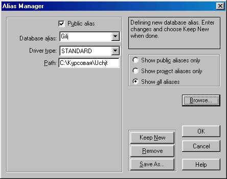 Нажмем кнопку New и в поле Database аlias введем имя псевдонима Учет, кнопкой Вrowse выберем наш каталог с базой Жилье, далее Кеер New и ОК.