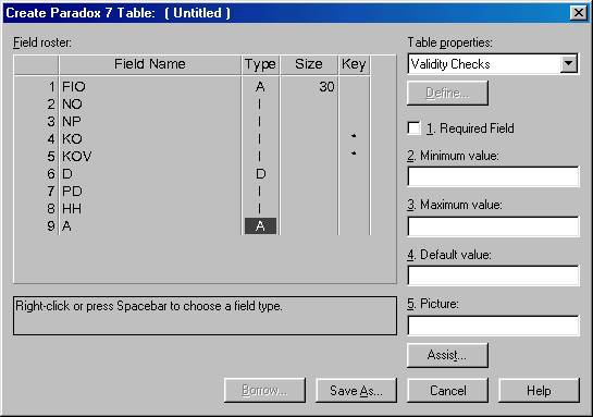 Туре - тип поля (указывается выбором из контекстного меню): А1рhа (А - строка из не более чем 255, символов), Number (N - число с плавающей точкой), Моnеу ($ - аналогичен типу NumЬег, но добавляется денежный знак), Short (S - целое число в диапазоне -32768 32767), LongIntereger (I целое число в диапазоне-2147483 2147483647), ВСD (# - число в двоично-десятичном формате), Datе (D - дата). Time (Т - время), Timestamp (@ - дата и время), Меmо (М - строка любой длины), Formatted Memo (F - аналогичен Меmо, но может содержать форматированный текст), Graphic (G -изображение ВМР, РСХ, ТIF, СИР, ЕРS), ОLЕ (О - объект ОLЕ), Logical (L логическое - Т, F), Autoincrement (+ - при добавлении записи, автоматически формируется уникальное значение), Вinary (В – последовательность байтов любой длины), Вуtes (У последовательность не более, чем 255 байтов).