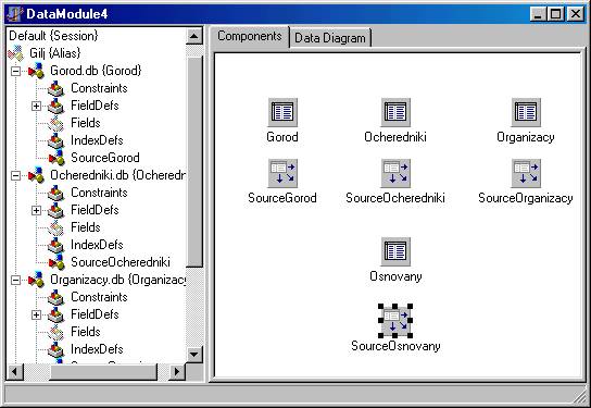 Active=True (чтобы можно было обращаться к таблице из программы). Аналогично сделаем для трех оставшихся таблиц. Далее разместим компонент DataSource (источник данных) и выделим его. Зададим свойства:DataSet=Ocheredniki (имя таблицы) , Name=SourceOcheredniki (имя компонента).
