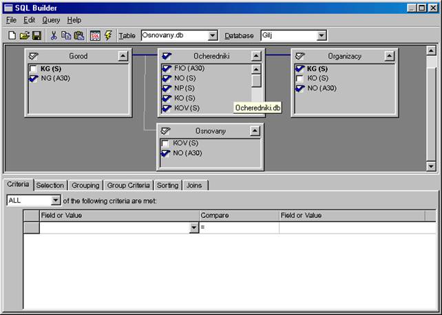 В списке Database выберем базу Uchjt Используя список Таblе, выберем таблицы очередники, города, организации, основания. Мышкой установим связь между этими таблицами по полям NO и КO соответственно Галочкой пометим поля, выводимые в запрос На странице Criteria зададим условия отбора записей.