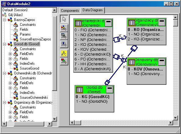 Существует визуальный способ установки связей Выберем модуль данных и откроем страницу Data Diagram окна DataModule2 Перенесем последовательно мышкой из проводника этого окна узлы с именами таблиц Ocheredniki, Orgahizacy, Gorod, Osnovany на страницу Data Diagram Щелкните на кнопке Маster Datail Проведите линию при нажатой левой кнопке мыши от таблицы Ocheredniki до таблицы Organizacy; появится окно Field Link Designer. Установите значения для полей и нажмите кнопку Аdd и ОК, связь установлена, и появится линия связи. Аналогично устанавливается связь и остальных таблиц. Объекты схемы данных можно прокомментировать: нажмите кнопку Соттеnt В1осК и щелкните мышкой на свободном месте схеме и в появившемся прямоугольнике введите текст комментария, щелкните по кнопке Соттеnt Аlludе и протяните линию от комментария к нужному объекту.