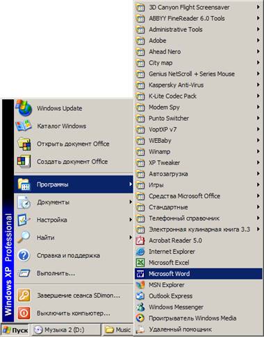 1. Работа над документом начинается с включения ПК. После того, как на экране появился Рабочий стол, мы в Панели задач щелкаем мышью на кнопке Пуск и открываем меню, выбираем пункт <<Программы» (он находится сразу под разделительной линией в меню Пуск), в нем щелкаем на Microsoft Word.
