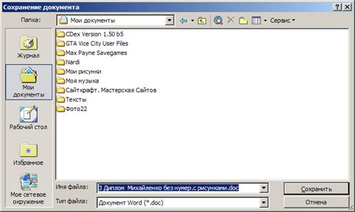 7. Появится диалоговое окно Сохранение документа, где мы должны выбрать необходимую папку (это может быть диск С, А, D, папка Мои документы, папка Рабочий стол и т.д.), где будет храниться ваш документ; дать имя своему файлу; указать тип файла. После этого следует нажать кнопку Сохранить.