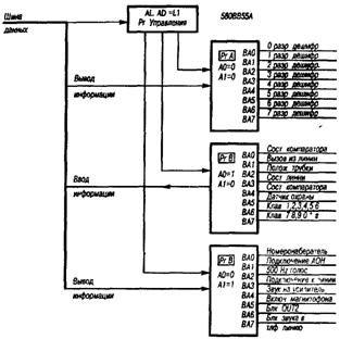 Схема АОНа предусматривает подключение его к телефонной линии только под управлением микропроцессора. При снятии абонентом телефонной трубки ЦП, опрашивая состояние узла «Определение положения трубки» через порт ввода/вывода D6 (ВВ2), определяет во время обработки прерывания, что трубка телефона снята, и подключает разговорную схему выдачей на порт ввода/вывода D6 (ВСЗ) сигнала лог. 1.