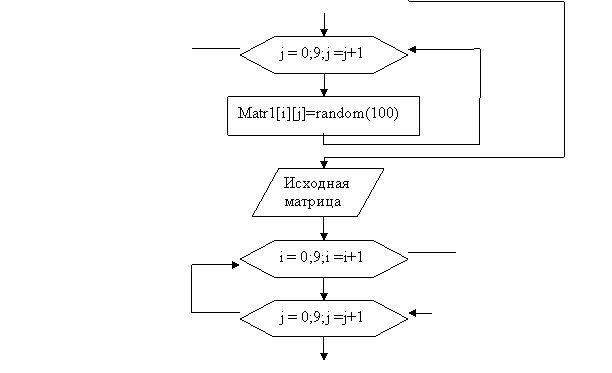 Открываем тело главной функции и объявляем переменные в соответствии с п.5.2. Присваиваем переменным iиj начальные значения (это можно было сделать и при их объявлении). Открываем цикл перебора строк с изменением i от 0 до 9 и цикл перебора столбцов с изменением jот 0 до 9. Внутренний цикл состоит из одного условного оператора, так что нет необходимости брать его тело в операторные скобки. Тело внешнего цикла берется в скобки.