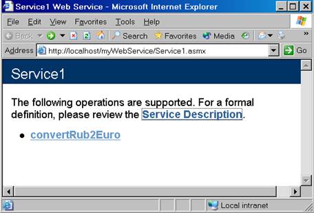 Нажав на Service Description. можно посмотреть в XML формате как и какие методы поддерживает наша web служба. Ниже приведен увиденный результат: