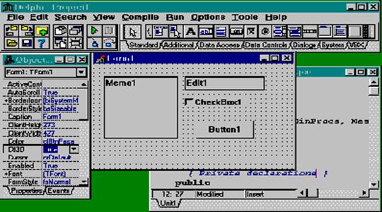Из этой палитры компонент можно выбирать компоненты, из которых можно строить приложения. Компоненты включают в себя как визуальные, так и логические компоненты. Такие вещи, как кнопки, поля редактирования - это визуальные компоненты; а таблицы, отчеты - это логические.