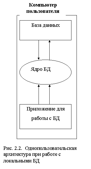 При работе с локальными базами данных сами БД расположены на том же компьютере, что и приложения, осуществляющие доступ к ним. Работа с БД происходит в однопользовательском режиме. Ядро БД распложено на компьютере пользователя. Приложение ответственно за поддержание целостности БД и за выполнение запросов к БД. Общая схема однопользовательской архитектуры показана на рис.2.2.