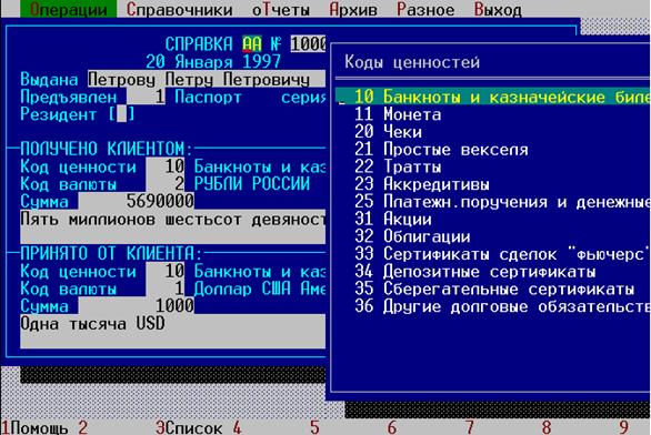 Рис.15 Бланк регистрации валютно-обменной операции и фрагмент справочника ценностей |