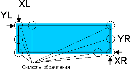 Экранные координаты передаются в виде числовых величин в порядке, принятом для команд BOX, CLEAR и т.п. YL,XL - левый верхний, YR,XR - правый нижний угол. Символы заполнения передаются в виде строковой переменной, содержащей последовательно символы обрамления, начиная с верхнего левого угла по часовой стрелке. Последним в последовательности является символ заполнения внутренней области окна. Цветовая гамма устанавливается по умолчанию по текущим установкам.