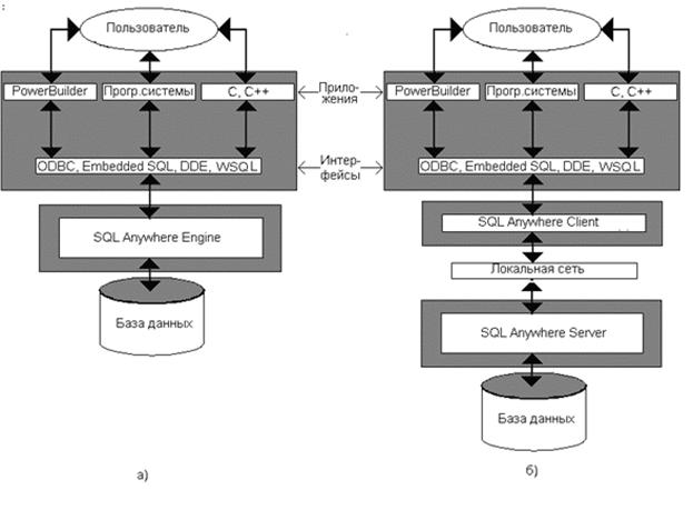 Рис. 1. Взаимодействие приложений-клиентов с базой данных в различных вариантах СУБД SYBASE SQL Anywhere: а) Автономный вариант; б) Сетевой вариант.