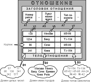 Доменом называется множество атомарных значений одного и того же типа. Смысл доменов состоит в следующем. Если значения двух атрибутов берутся из одного и того же домена, то, вероятно, имеют смысл сравнения, использующие эти два атрибута (например, для организации транзитного рейса можно дать запрос "Выдать рейсы, в которых время вылета из Москвы в Сочи больше времени прибытия из Архангельска в Москву"). Если же значения двух атрибутов берутся из различных доменов, то их сравнение, вероятно, лишено смысла: стоит ли сравнивать номер рейса со стоимостью билета? Отношение на доменах D1, D2, ., Dn (не обязательно, чтобы все они были различны) состоит из заголовка и тела. На рис. 3 приведен пример отношения для расписания движения самолетов.