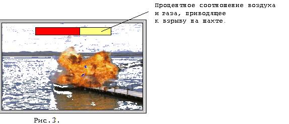 Например, можно продемонстрировать кадры взрывов на мукомольной фабрике или в шахте. Для этого можно воспользоваться картинками из библиотеки данных пакета MV или создать свою, просканировав их при помощи модуля PhotoMaster со слайдов, фотографий. Из полученных картинок в модуле Animator непосредственно создается мультфильм. Использование информационных технологий (пакет MV) дает возможность не только визуально показать такой взрыв, но и продемонстрировать процентное соотношение воздуха и пыли (или газа) на единицу объема, приводящее к взрыву (рис.3.), т.е. показать при каких условиях вероятность взрыва максимальна.
