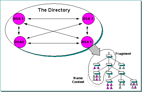 Чтобы сократить время, затрачиваемое на обработку пользовательского запроса, применяется метод репликации (replication) фрагментов между системными агентами каталога. В этом случае DSA отслеживает изменения, вносимые в подотчетный ему фрагмент, и доставляет их остальным системным агентам. В этом случае относительно актуальная копия всего каталога доступна для поиска каждому DSA системы, однако использование такой схемы требует дополнительных затрат ресурсов на размещение избыточных копий информации. Следует заметить, что для почтовых систем, данный вариант организации доступа к каталогу является единственно возможным, так как отдельные фрагменты могут не иметь непосредственного соединения друг с другом. Единицей репликации данных является пространство имен (Name Context), представляющее собой отдельную ветвь общего дерева. Рисунок 1.12 поясняет различия между фрагментом и пространством именования.