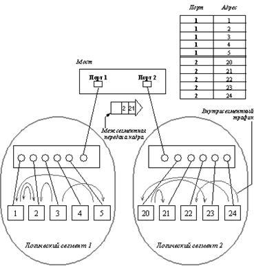 Мост (bridge), а также его быстродействующий функциональный аналог - коммутатор (switching hub), делит общую среду передачи данных на логические сегменты. Логический сегмент образуется путем объединения нескольких физических сегментов (отрезков кабеля) с помощью одного или нескольких концентраторов. Каждый логический сегмент подключается к отдельному порту моста/коммутатора (рис. 1.10). При поступлении кадра на какой-либо из портов мост/коммутатор повторяет этот кадр, но не на всех портах, как это делает концентратор, а только на том порту, к которому подключен сегмент, содержащий компьютер-адресат.